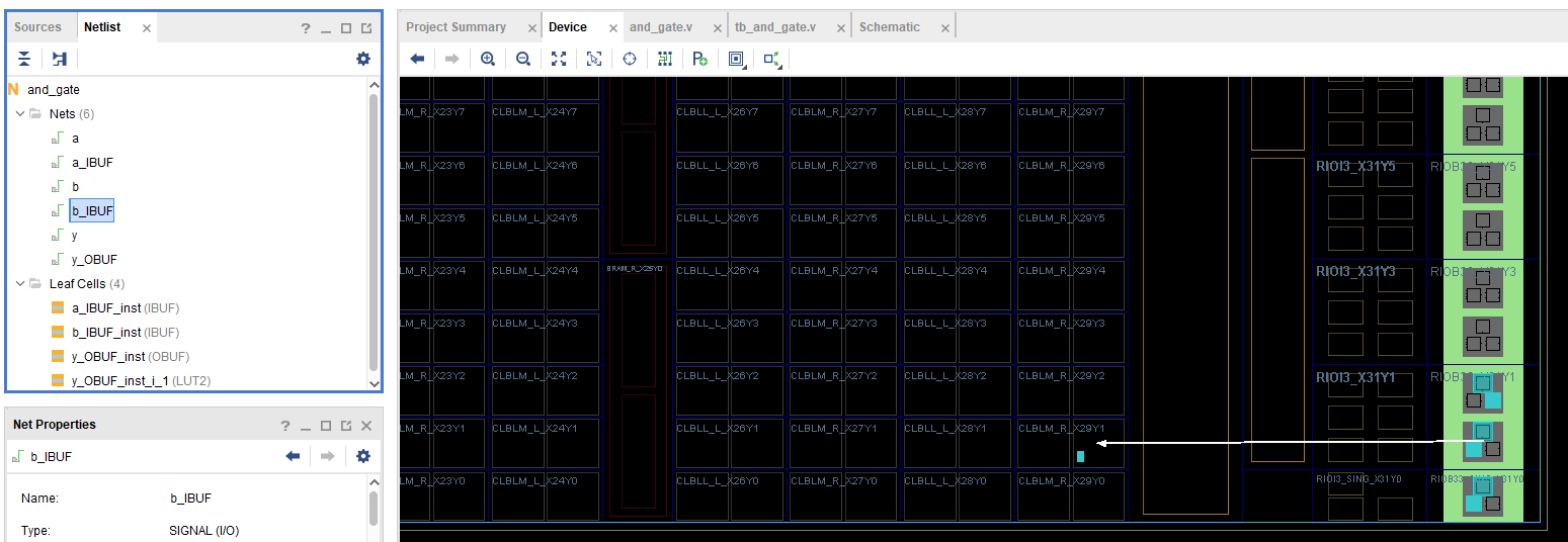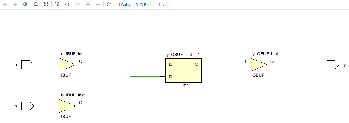 Schematic은 합성된 디자인의 시각적인 표현을 제공합니다. 이 옵션을 선택하면, FPGA 디자인의 모듈, 연결, 및 계층 구조를 그래픽 형태로 볼 수 있습니다. 스키매틱 뷰는 디자인의 다양한 부분이 어떻게 서로 연결되어 있는지 이해하는 데 도움을 줍니다. a와 b라는 두 입력 신호가 IBUF를 통해 FPGA 내로 들어와 LUT2에서 특정 논리 연산을 거친 후, OBUF를 통해 y라는 결과 신호로 외부로 출력되는 과정을 보여줍니다.