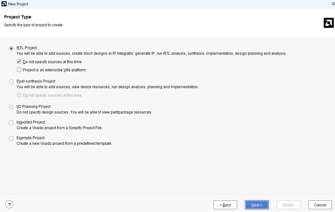 RTL (Register Transfer Level) 프로젝트로, 디지털 회로를 IP Integrator를 사용해 블록 설계를 만들거나, Verilog나 VHDL 같은 HDL(Hardware Description Language)을 사용하여 설계하고 실제로 구현하는 과정입니다. IP 생성, RTL 분석, 합성, 구현, 설계 계획 및 분석 등을 수행할 수 있습니다. 이 옵션은 프로젝트가 확장 가능한 Vitis 플랫폼으로 설정할 수도 있습니다.