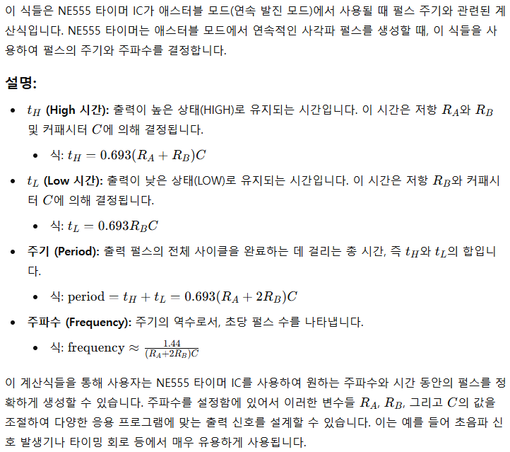 애스터블 모드에서는 NE555에 외부 저항과 커패시터를 연결하여 펄스의 주파수와 듀티 사이클을 조정할 수 있습니다. 이를 통해 초음파 센서가 적절한 속도로 펄스를 발산하고, 해당 신호를 사용하여 물체와의 거리를 측정할 수 있게 됩니다.
