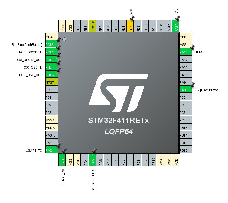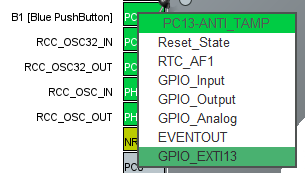 Botton1은 PC13에서 사용할것이고 기본적으로 GPIO_EXTI13 으로 되어있습니다. 이 버튼은 LED를 끄고 키는 버튼으로 사용됩니다.