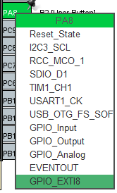 Botton2는 PA8에서 사용할것이고 기본적으로 GPIO_EXTI8 으로 되어있습니다. 이 버튼은 터미널에서 숫자를 증가시키는 버튼으로 사용됩니다.