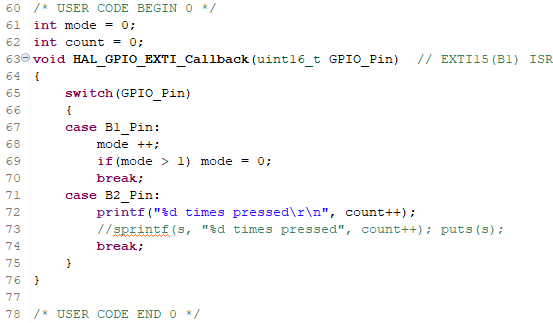 먼저 버튼 부분 코드를 HAL_GPIO_EXTI_Callback 함수를 통해서 작성합니다.