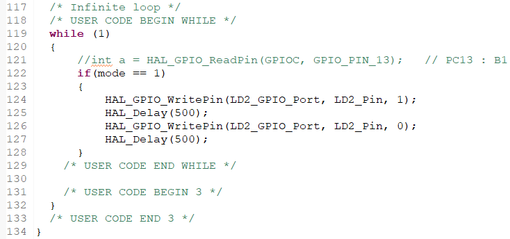 STM32 IDE 에서는 유저가 직접 코드를 작성하는 공간이 존재합니다. 그 외의 공간에 코드를 작성하게 되면 빌드를 했을 때 모두 사라지게 되니 유의해주시길 바랍니다.