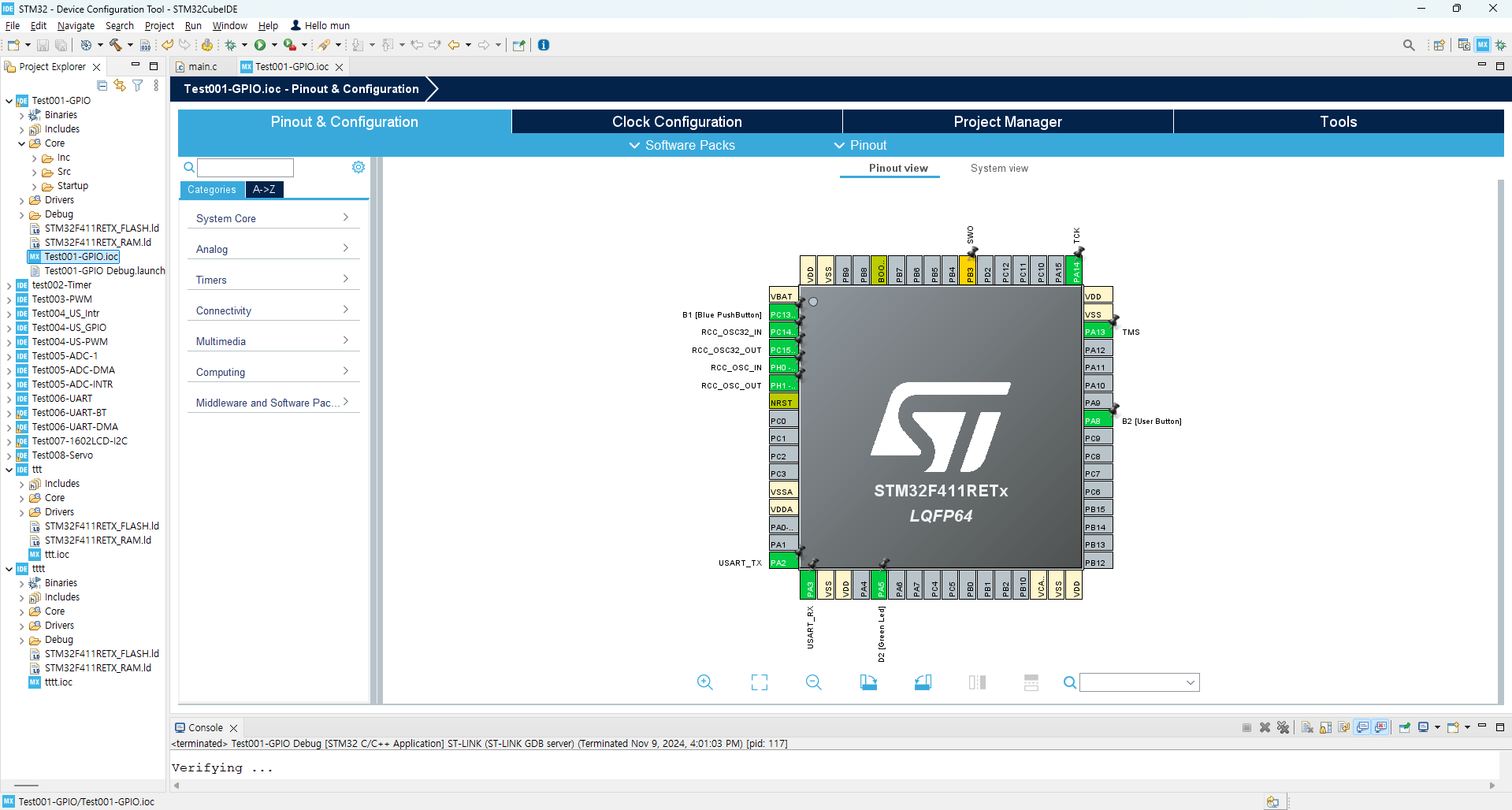 IDE를 생성하게 되면 STM32F411RETx 마이크로컨트롤러를 위한 STM32CubeIDE 소프트웨어 인터페이스를 보여줍니다. Pinout & Configuration 특정 프로젝트에 맞게 마이크로컨트롤러의 핀과 주변 장치를 설정할 수 있습니다. 화면의 중앙 부분은 STM32F411RET6 칩의 레이아웃을 보여주며, VBAT, I/O 핀, 전원 공급 핀(VDD, VSS) 등의 기능을 나타내는 라벨이 있는 색상으로 구분된 핀 할당을 표시합니다.