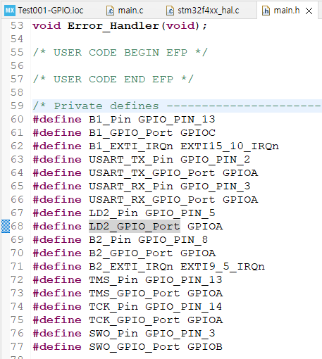 LD2_GPIO_Port는 GPIOA 포트이고 B1)Pin은 GPIO_PIN_13 입니다.