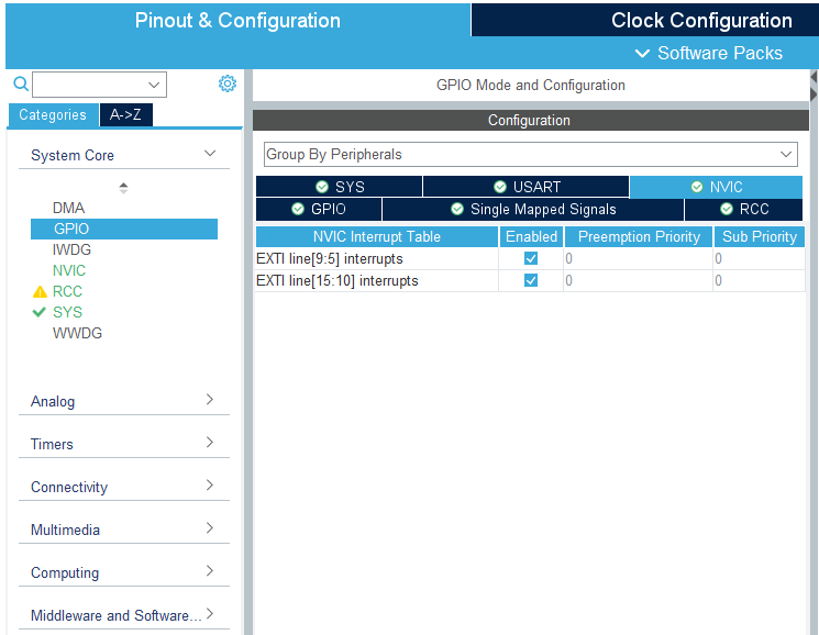 핀 설정후 버튼 동작을 위해 EXTI Line interrupts가 Enabled 표시가 체크가 되어있는지도 확인해줍니다.