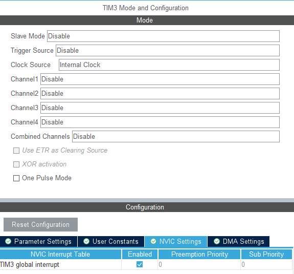 타이머3을 활성화 합니다. Internal Clock을 체크하여 타이머의 클록 소스로 내부 클록을 사용하고 채널은 모두 Disable 하여 독립적으로 작동시킵니다.