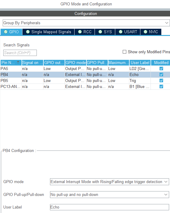 PB4 신호에서 GPIO 모드를 외부 인터럽트 모드로 설정하여 상승 에지와 하강 에지 모두에서 트리거될 수 있도록 설정합니다. 이 설정은 에코 신호의 시작과 끝을 감지하는 데 사용되며, 이를 통해 센서가 물체까지의 거리를 계산할 수 있도록 합니다.