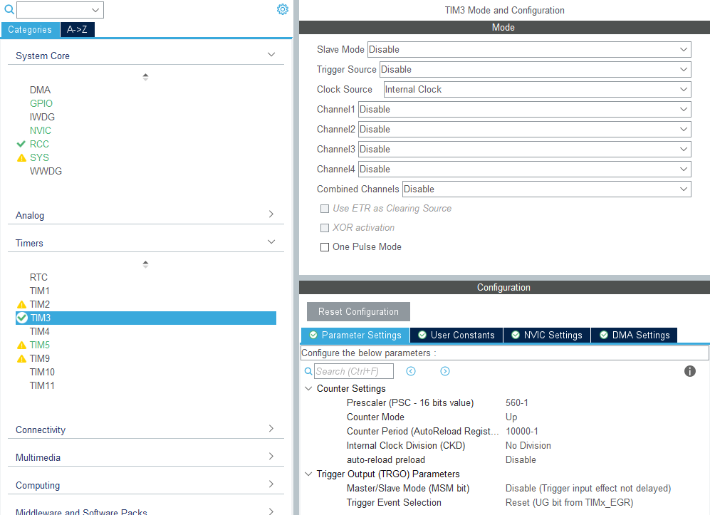 Prescaler를 560으로 나누고 카운터의 최대 값을 10000-1로 설정하여 오버플로우 주기를 결정합니다. TIM3 타이머 관련 글로벌 인터럽트를 활성화 시켜 타이머의 오버플로우, 이벤트 업데이트 등에 대응하도록 합니다.